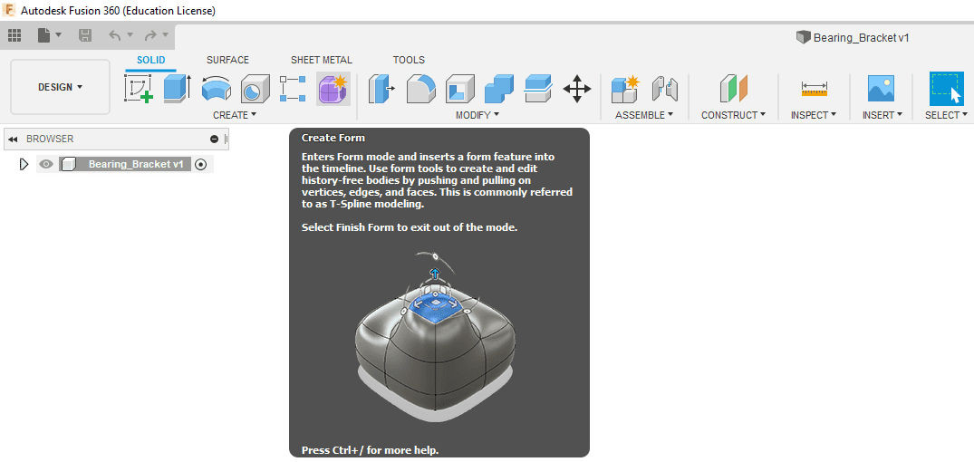 The form feature, denoted by a purple cube, allows the sculpting of complex organic shapes. It opens a new workspace that has a wide array of features for sculpting complex shapes. This feature is ideal for creating organic and artistic models for 3D printing.